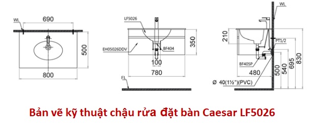 – KT :Lavabo L5026: 500 x 800 x 210mm